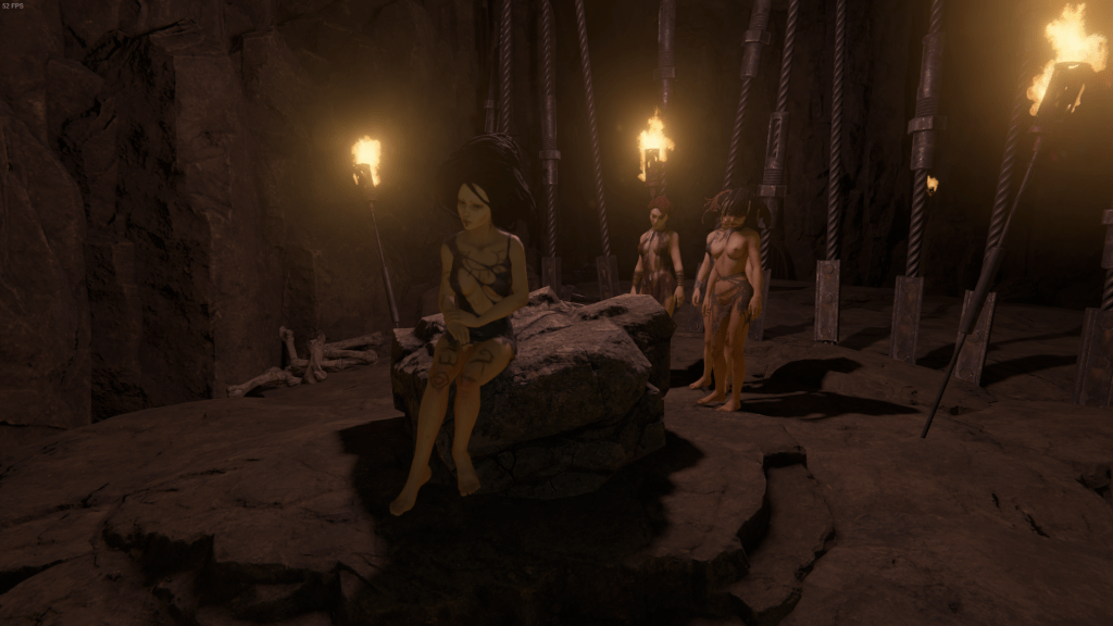 Immediately all of your items are removed as you step into the dingey, dark underground cave system that forms the Abattoir. Shamanistic runes are scrawled across the walls and strange noises echo through the chambers that you move through. You immediately speak to an injured worm man who informs you of the living blood that flows from the rocks around you, he claims it’s the blood of their god – Mother Boddo and while you can drink it to heal yourself, if you’ve done certain events in the game you’ll know it has another use.