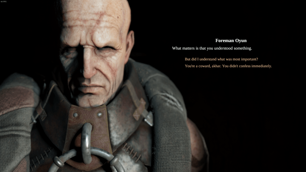 If you do decide to prioritise speaking to Oyun you have to make the journey back through the Abattoir, although this time there is no danger and no plague which again throws the reality of the experience you just had here into question. When you finally reach the centre and see the looming figure of Oyun, the game hits you with one of the most brutal narrative gut punches I think I’ve ever seen.