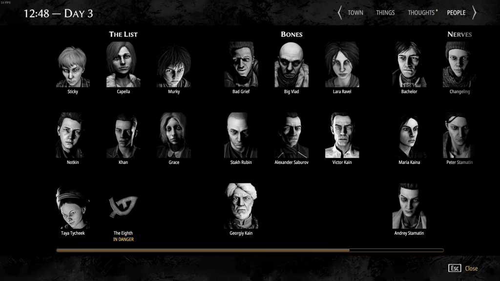 After attending your father’s funeral on Day 2, Artmey is given his “inheritance” which consists of a piece of paper with a list of children on it. You quickly discover that Isidor was tutoring a select group of the townsfolk and Kin’s children but to what purpose Artemy has been given this remains completely unclear. Throughout the game you can forge relationships with the children and they can form a structure to the healing gameplay. I focused most of my efforts on protecting the children at all costs but it wasn’t stated anywhere in the game that this was an actual goal to be achieved and there is also absolutely no punishment if you do allow them to die.